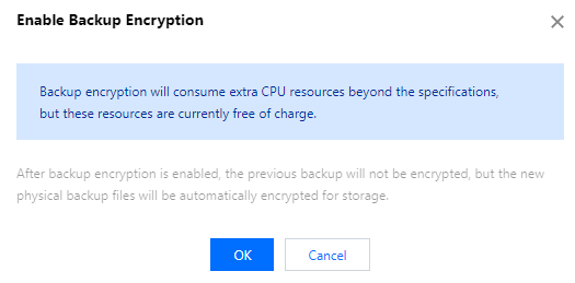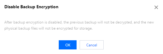 백업 암호화가 활성화된 후에는 복제와 같은 관련 작업 전에 백엔드가 자동으로 백업을 해독하므로 콘솔에서 백업을 수동으로 해독할 필요가 없습니다. 그러나 암호화된 백업을 다운로드하는 경우 암호 해독을 위해 해당 키를 다운로드해야 합니다. 자세한 내용은 물리 백업을 사용하여 데이터베이스 복구를 참고하십시오. 백업 암호화 활성화