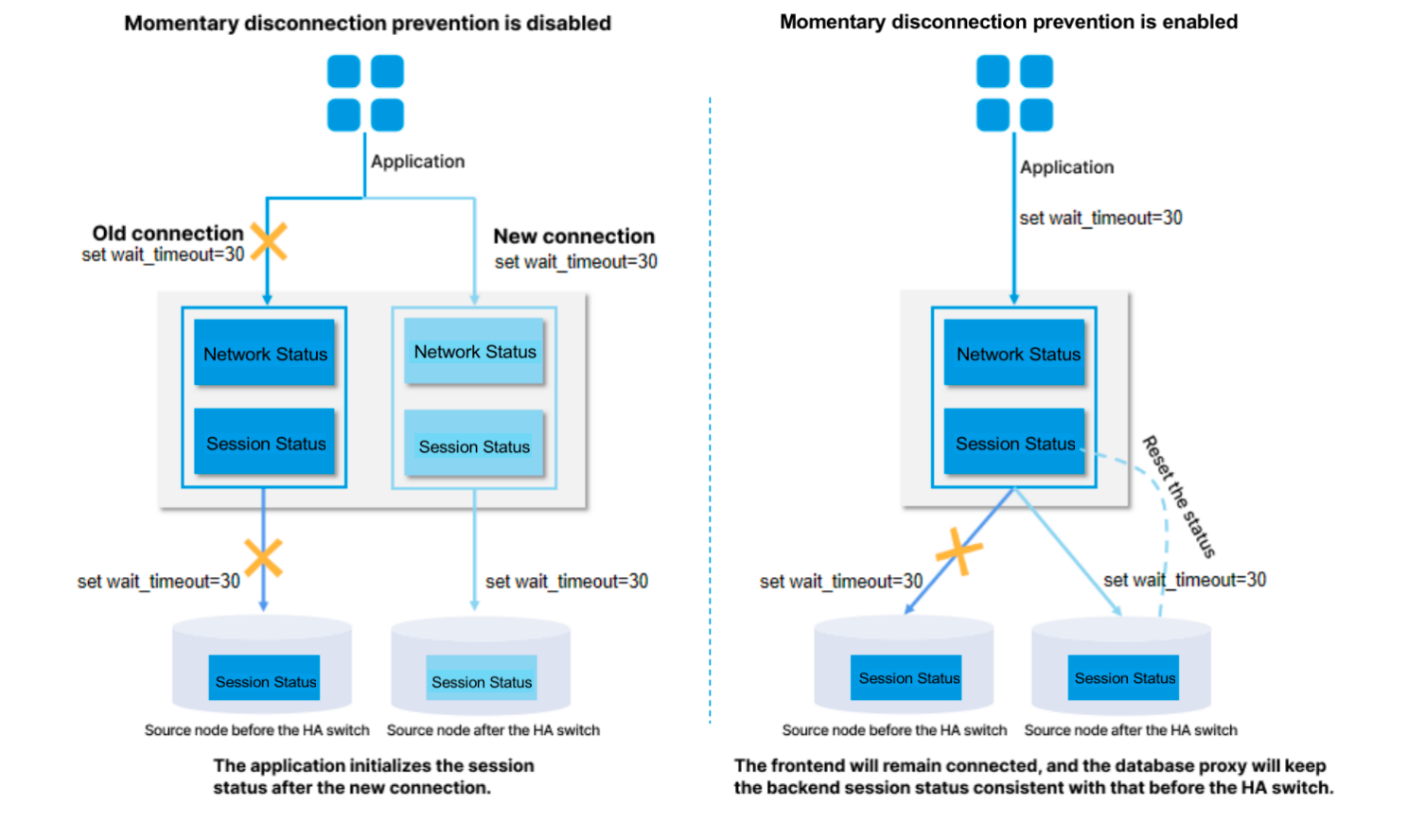 순간 연결 끊김 방지 기능은 MySQL의 session track 메커니즘을 구현합니다. 손실 동작이 감지되면 데이터베이스 프록시는 전환 전에 소스 노드에서 클라이언트 연결을 끊고 전환 후에 소스 노드에 연결합니다. 그 다음 세션 관련 시스템 변수, 사용자 변수 및 문자 세트 인코딩 정보는 session track 메커니즘을 통해 새로운 백엔드 연결로 전송되어 애플리케이션 측에서 무손실 전환을 구현합니다.