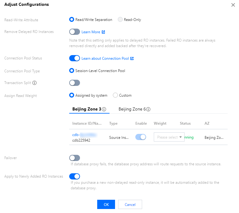 새로 추가된 RO 인스턴스에 적용 | 이 기능을 활성화할지 여부를 설정할 수 있습니다. 활성화되면 새로 구입한 읽기 전용 인스턴스가 데이터베이스 프록시에 자동으로 추가됩니다. 읽기 가중치 할당이 시스템에서 할당됨으로 설정된 경우 새로 구매한 읽기 전용 인스턴스에는 사양에 따라 기본 가중치가 할당됩니다. 읽기 가중치 할당이 사용자 지정으로 설정된 경우 새로 구입한 읽기 전용 인스턴스가 추가되면 해당 가중치는 기본적으로 0이 되며 데이터베이스 프록시 탭의 연결 주소에서 구성 조정을 클릭하여 수정할 수 있습니다. |