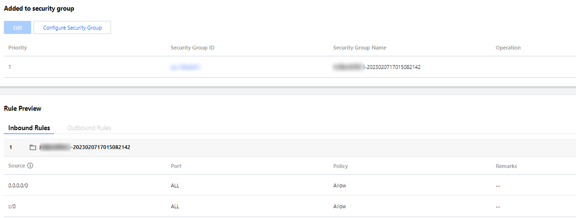 2. 인스턴스 관리 페이지에서 보안 그룹 탭을 선택하고 보안 그룹 구성을 클릭하여 모든 포트를 열도록 보안 그룹 규칙을 구성한 후, 보안 그룹이 퍼블릭 IP에서 액세스를 허용하는지 확인합니다. 구성에 대한 자세한 내용은 CDB 보안 그룹 관리를 참고하십시오.