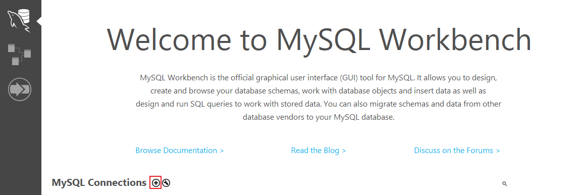 5. MySQL Workbench가 설치되면 열고 MySQL Connections 뒤의 더하기 기호를 클릭하여 대상 인스턴스의 정보를 추가합니다.