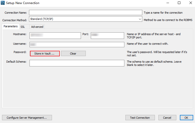Store in Vault... | 비밀번호 필드에 대상 MySQL 인스턴스의 Username 계정 비밀번호를 입력하고 저장합니다. |