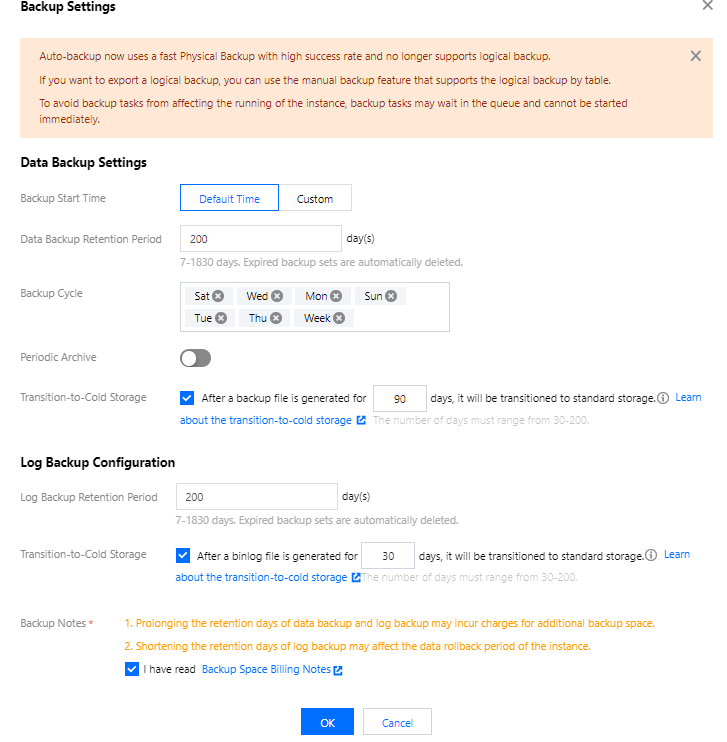콜드 스토리지 전환은 데이터 파일 백업 및 binlog 파일 백업에 개별적으로 설정할 수 있습니다.