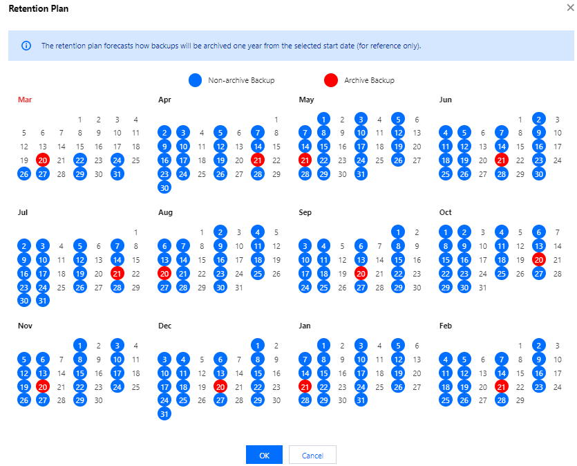 1. 백업 보관 기간 ≤ 31일: 콜드 스토리지 전환 설정이 불가능합니다. 사용하려면 백업 보관 기간을 31일 이상으로 설정하세요.