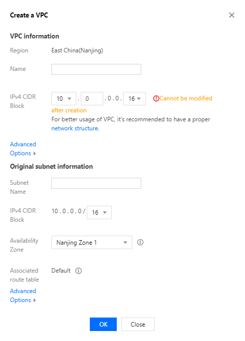 3. VPC 정보와 초기 서브넷 정보를 작성하고 확인을 클릭합니다. VPC와 서브넷의 CIDR 생성 후에는 수정할 수 없습니다.