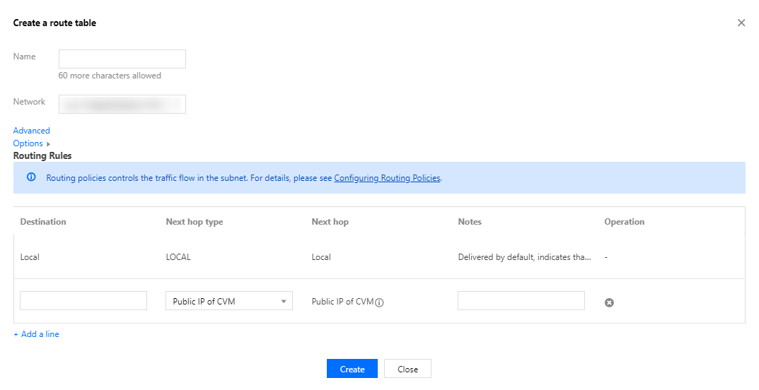 3. 팝업 대화 상자에 이름, 소속 네트워크 및 생성 라우팅 정책을 입력하고 생성을 클릭합니다. 라우팅 테이블 리스트로 돌아가면 생성한 라우팅 테이블을 확인할 수 있습니다.