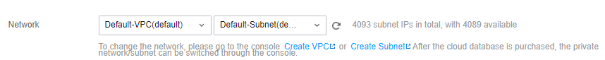2. 구매 페이지의 네트워크 옵션에서 사설 네트워크를 선택합니다. 이전에 생성한 사설 네트워크 및 해당 서브넷을 선택하고, 구매한 CDB를 사설 네트워크에 추가합니다.