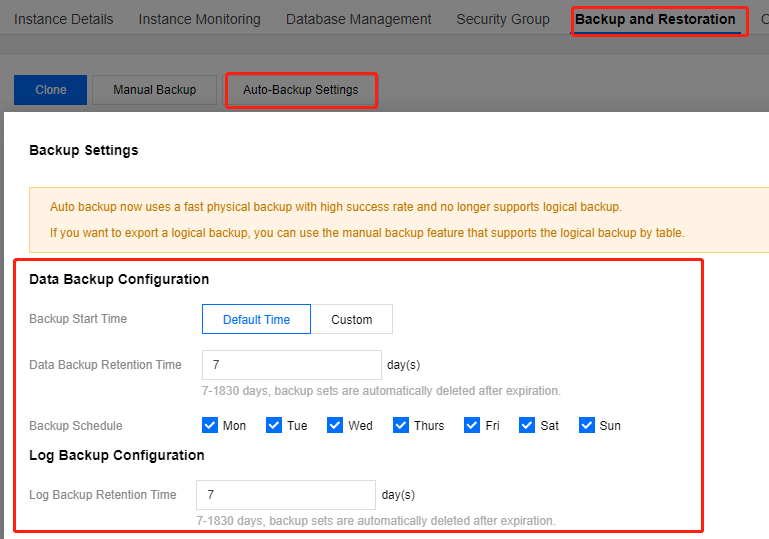 롤백 기능은 데이터 백업 및 로그 백업(binlog)의 백업 주기 및 보존 일수에 의존합니다. 자동 백업 빈도 및 보존 기간을 줄이면 롤백이 영향을 받습니다. 필요에 따라 매개변수를 선택할 수 있습니다. 자세한 내용은 데이터베이스 롤백을 참고하십시오. 비핵심 업무에 대한 데이터 및 로그 백업의 보관 기간을 단축합니다(보관 기간은 7일로 대부분의 경우 요구 사항을 충족할 수 있습니다).