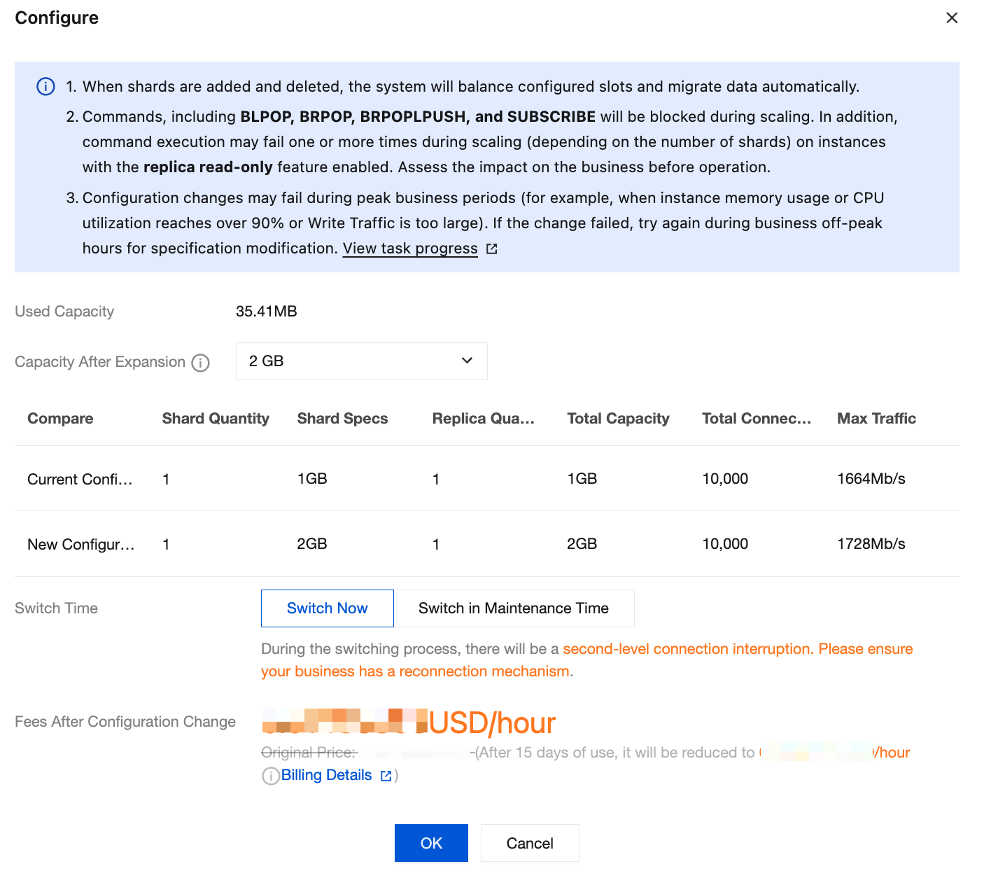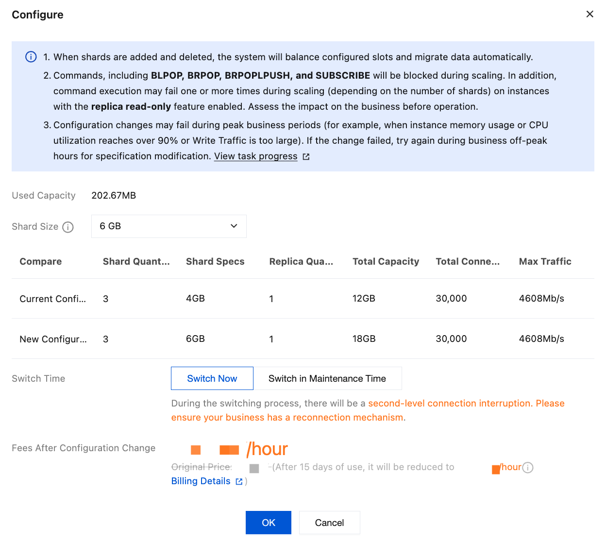 Compare | Compare the current configuration with the new configuration, including Shard Quantity, Shard Specs, Replica Quantity, Total Capacity, Total Connections, and Max Traffic. |