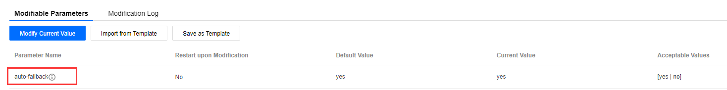 6. On the Parameter Settings tab, click the Modifiable Parameters tab, find auto-failback in the parameter list, and set it to yes.