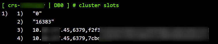 CLUSTER SLOTS is used to get the mapping relationship between cluster slots and Redis instances. Each returned result contains: