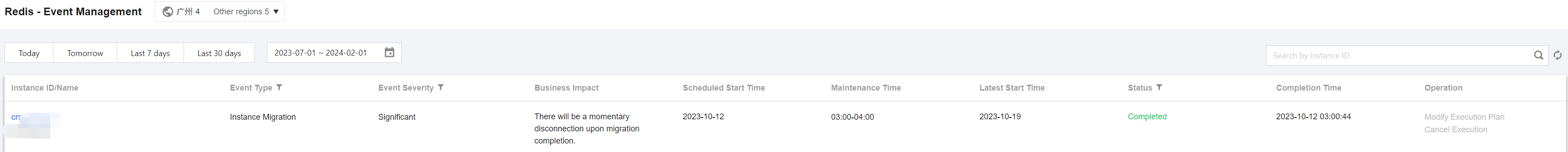 Event Type | The type of pending Ops events for the current instance. Currently supported types include minor version upgrade and instance migration. Migration refers to Ops operations related to resource movement and IDC deletion, for example: host machine vulnerability remediation. The event level is Critical. Once initiated, the task cannot be canceled. |