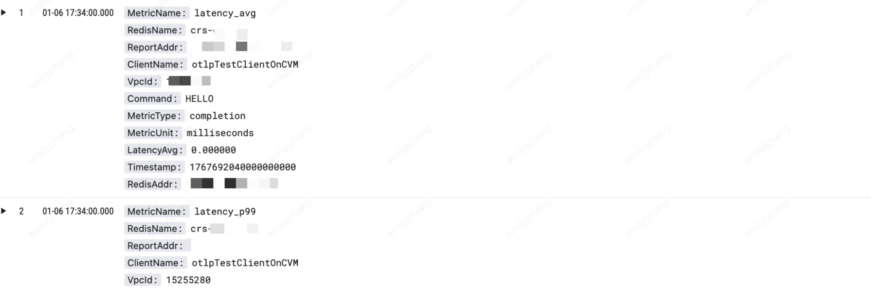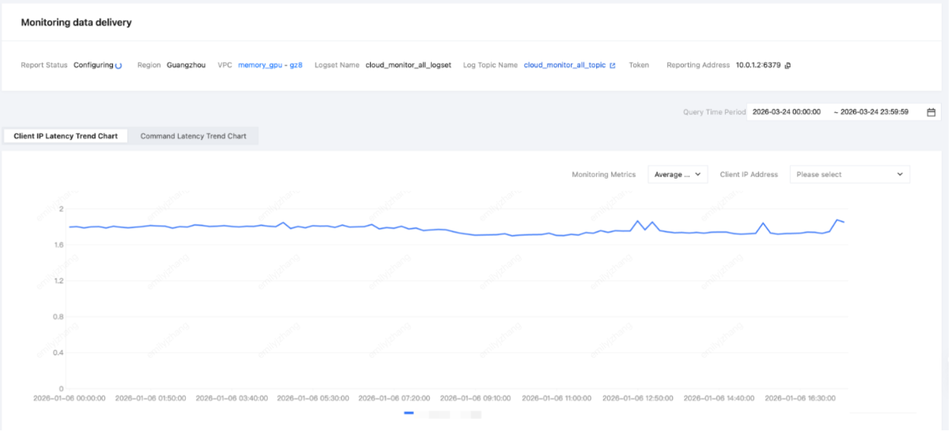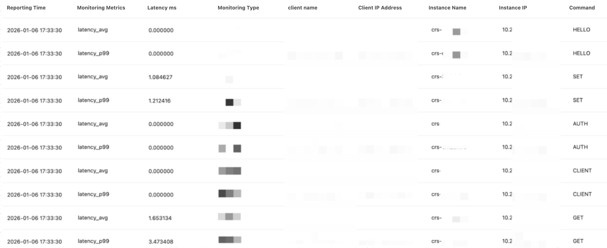 On the Distributed Cache - Full-Link Analysis page, the aggregated monitoring data from CLS allows you to visualize the full-link latency from client request initiation to response receipt, with statistical results presented in tabular format, as shown in the following figure.