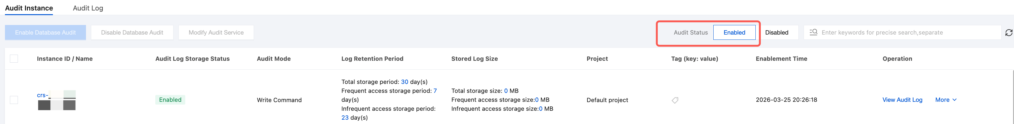 Operation | Click View Audit Log to view detailed information of the instance's audit logs. For specific information, see Managing Audit Logs. Click More > Modify Audit Service to modify audit configuration information, including audit type, audit log retention period, and other settings. For specific information, see Modify Audit Configuration. Click More > Disable Database Audit to stop the audit feature. For specific information, see Disable Database Audit. |