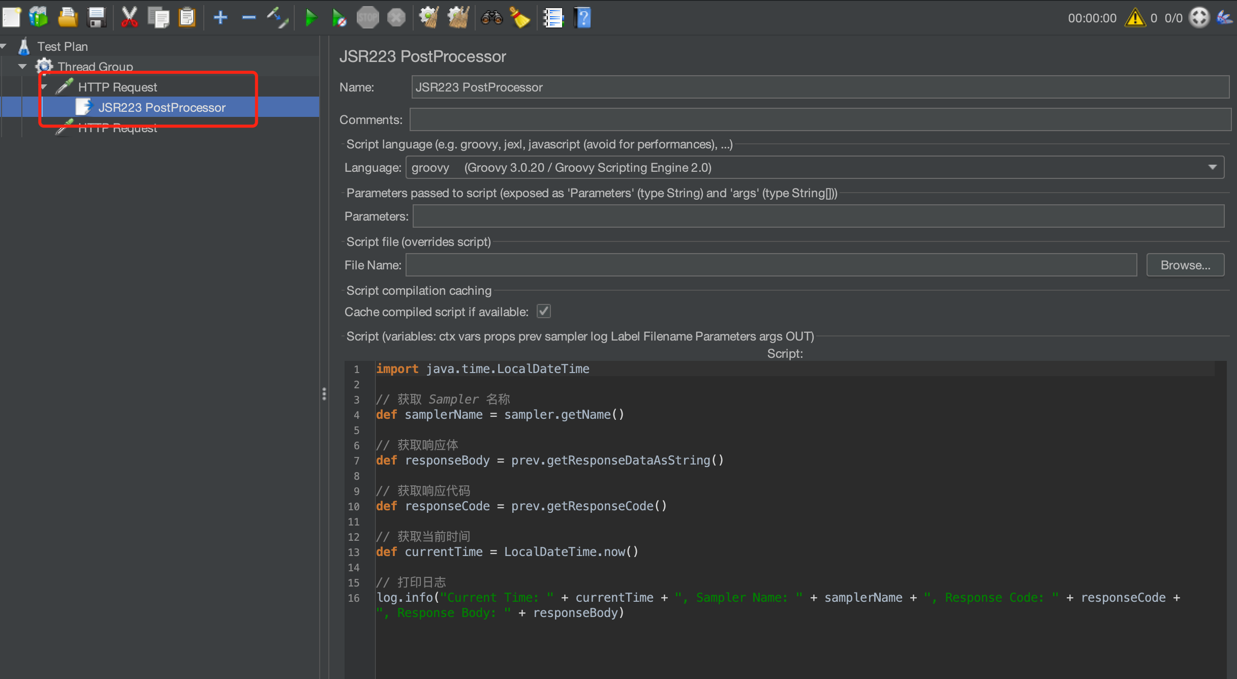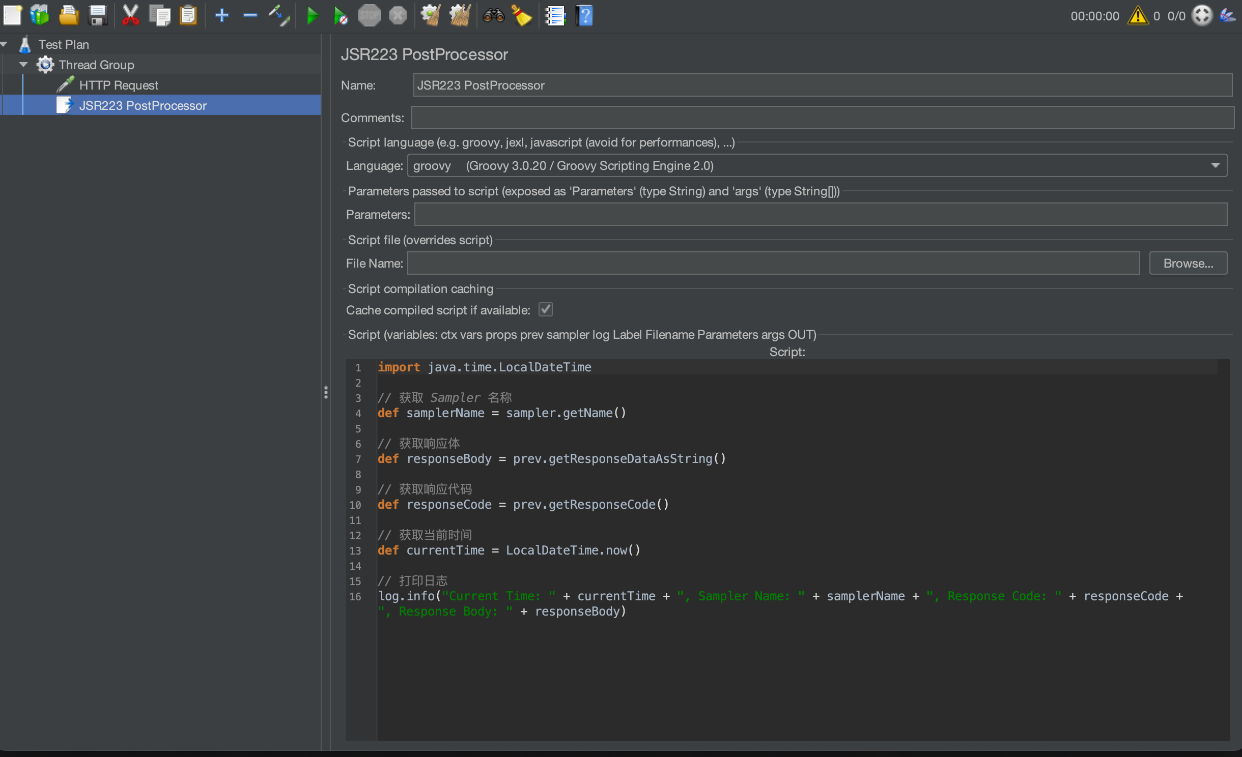 prev represents the result of the request sampling, SampleResult. You can see JMeter Official Documentation for the corresponding methods. If there is any other content to be printed, you can obtain and output the data as needed.import java.time.LocalDateTime// Obtain the Sampler name.def samplerName = sampler.getName()// Obtain the response body.def responseBody = prev.getResponseDataAsString()// Obtain the response code.def responseCode = prev.getResponseCode()// Obtain the current time.def currentTime = LocalDateTime.now()// Print logs.log.info("Current Time: " + currentTime + ", Sampler Name: " + samplerName + ", Response Code: " + responseCode + ", Response Body: " + responseBody)