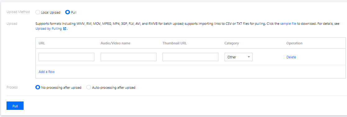 1. VOD 콘솔에 로그인하여 미디어 자산 관리>오디오/비디오 관리를 선택하면 ‘업로드 완료’ 페이지로 이동합니다. 2. 오디오/비디오 업로드를 클릭하여 ‘오디오/비디오 업로드’ 페이지로 이동합니다. 풀링 업로드는 WMV, RM, MOV, MPEG, MP4, 3GP, FLV, AVI, RMVB, HLS 및 기타 일괄 업로드 형식을 지원합니다.
