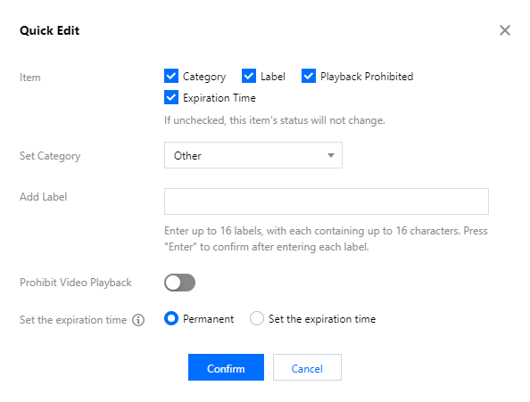 빠른 편집은 분류, 태그, 차단 및 만료 시간을 지원합니다. 해당 편집 항목을 선택하지 않으면 비디오 속성은 변경되지 않습니다.