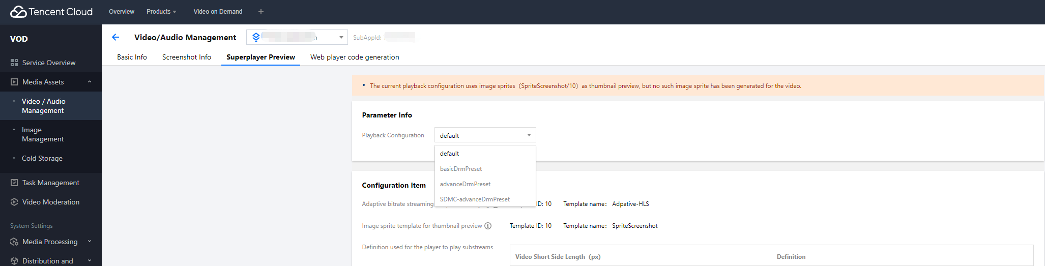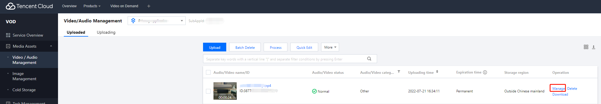 1. VOD 콘솔에 로그인하여 왼쪽 사이드바에서 애플리케이션 관리를 선택합니다. 2. 오디오/비디오 파일을 처리할 애플리케이션 이름을 클릭하여 애플리케이션 관리 페이지로 들어갑니다.