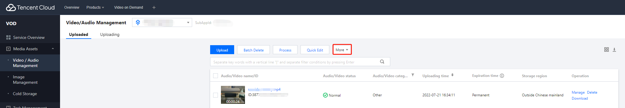 4. 더 보기를 클릭합니다. 비디오 상태 변경, 스토리지 등급 변경, 데이터 검색 등 VOD의 서비스 기능을 더 많이 얻을 수 있습니다.