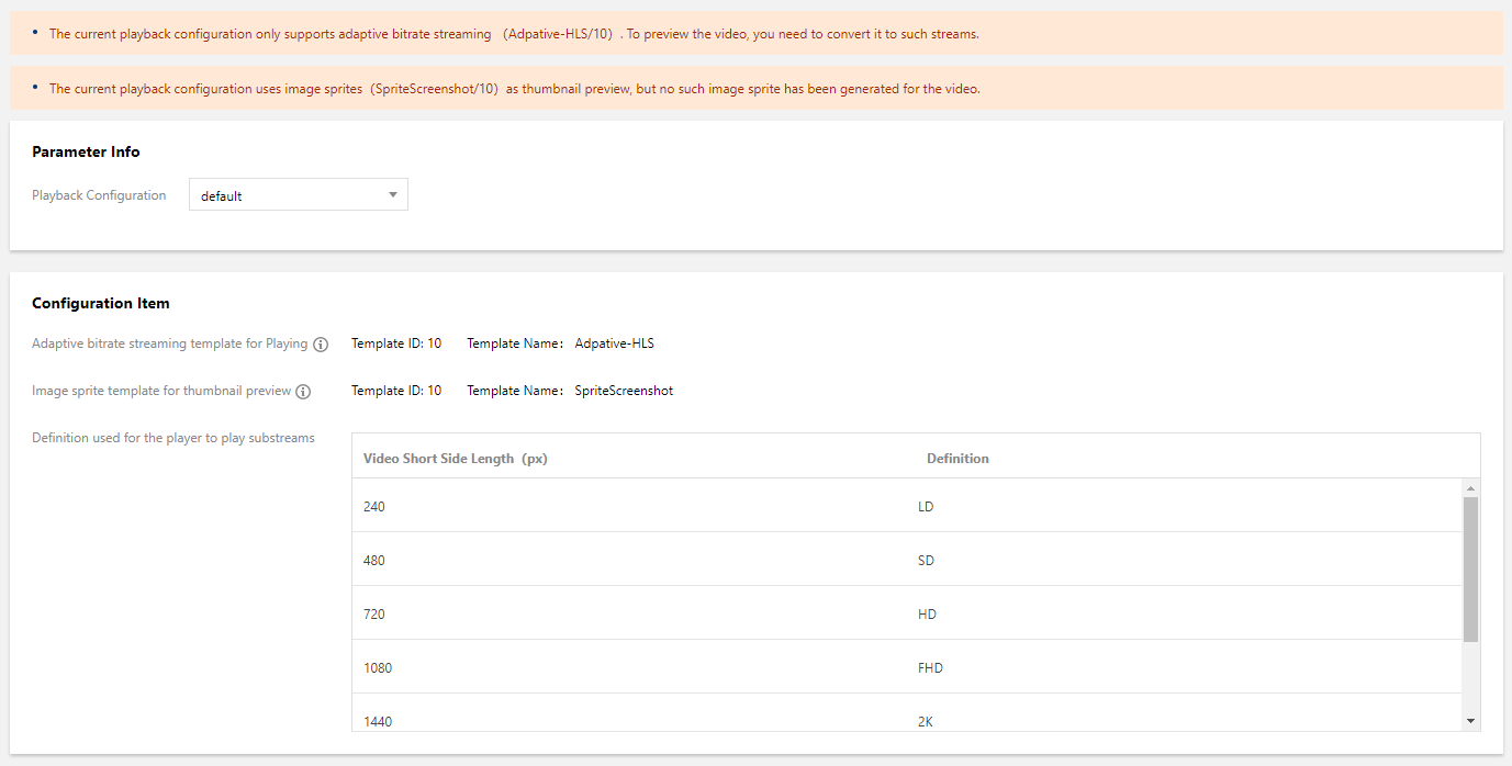 재생을 위한 어댑티브 비트 레이트 스트리밍 템플릿: 현재 플레이어가 템플릿으로 트랜스 코딩된 비디오를 미리 볼 수 있도록 어댑티브 비트 레이트 스트리밍 템플릿을 지정합니다.