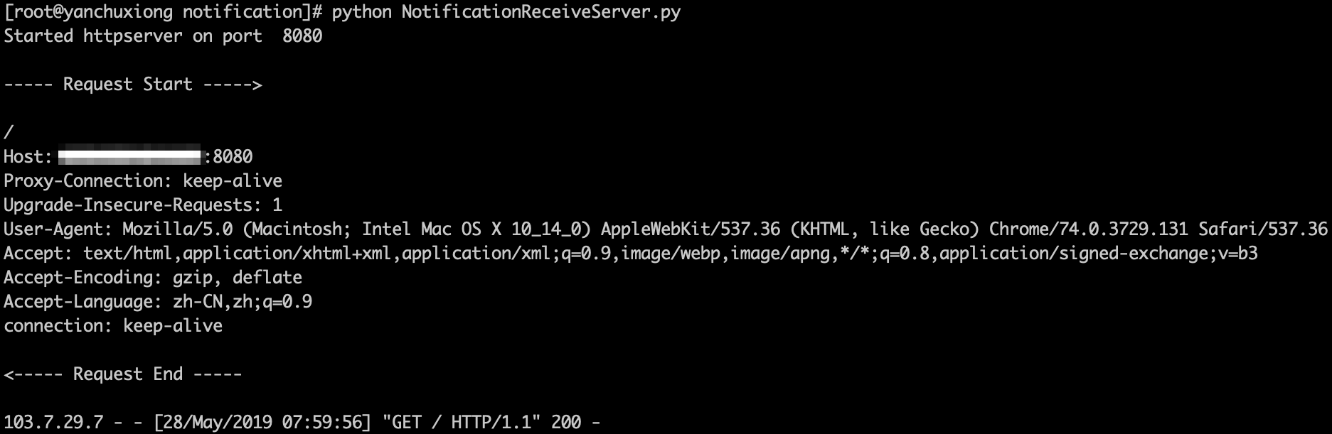 명령이 실행된 후 CVM 인스턴스의 표준 출력은 서비스 프로세스가 시작되었고 포트 8080에서 수신 대기 중임을 나타내는 Started httpserver on port 8080가 출력됩니다. 5. 브라우저에 http://134.XXX.XXX.167:8080을 입력하면 CVM 인스턴스의 표준 출력은 다음 HTTP 요청 정보를 출력합니다.
