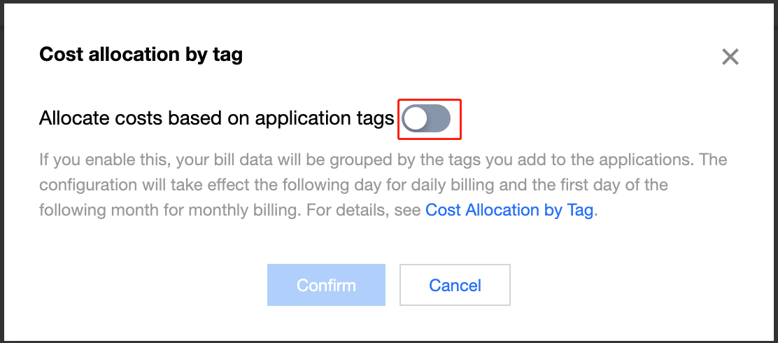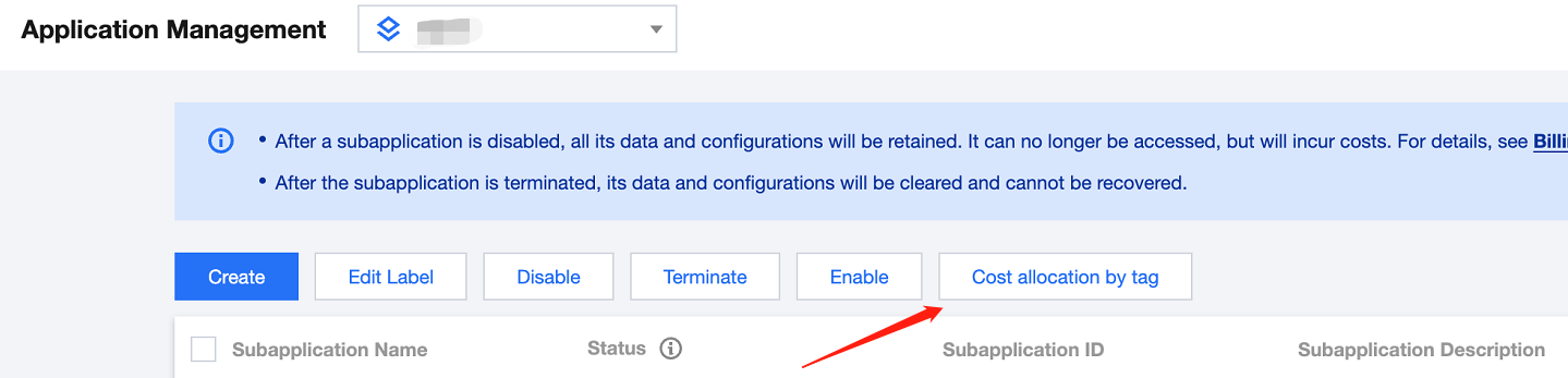 1. VOD 콘솔에 로그인하여 왼쪽 사이드바에서 애플리케이션 관리를 클릭하여 애플리케이션 목록 페이지로 들어갑니다. 2. 태그별 비용 할당을 클릭합니다. 팝업 창에서 기능을 켭니다.