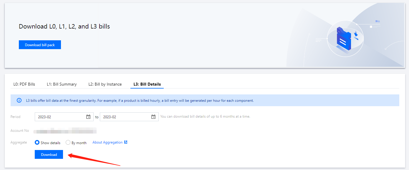 4. 구성은 일 결산 청구서의 경우 다음 날에 적용되고 월 결산 청구서의 경우 다음 달 1일에 적용됩니다. 청구서가 생성되면 청구서 다운로드 센터로 이동하여 L3-청구 명세서 탭에서 데이터를 다운로드하여 애플리케이션별로 그룹화된 청구서 데이터를 볼 수 있습니다.