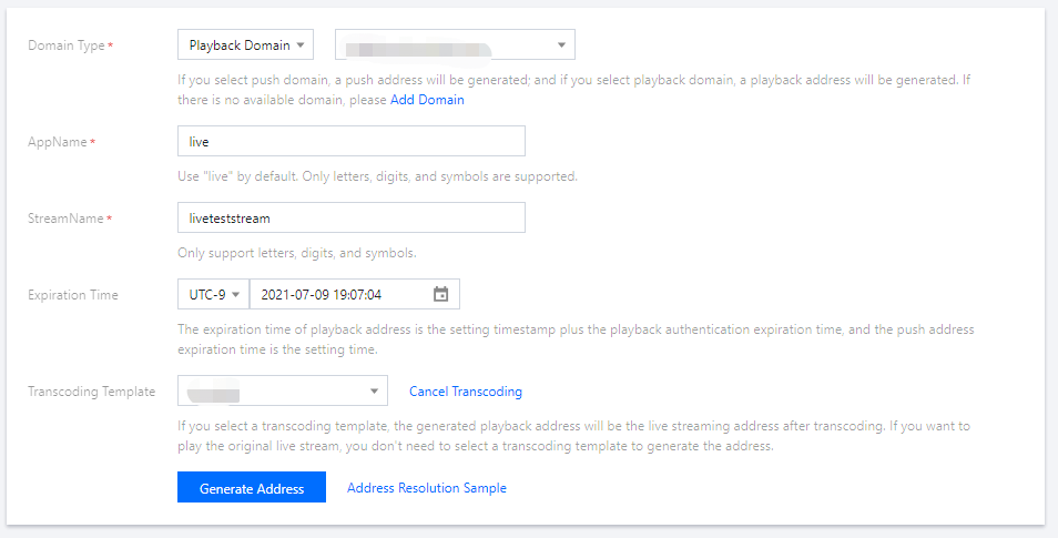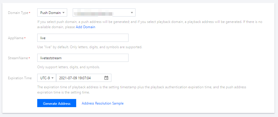 1. 라이브 방송 툴박스 > 주소 생성기를 선택합니다. 2. 주소 생성기 페이지에서 다음과 같이 설정합니다.