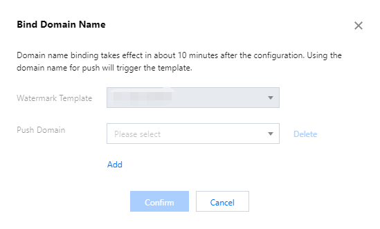 1. 도메인 바인딩 창에서 바인딩할 워터마크 템플릿과 푸시 도메인을 선택하고 [Confirm]을 클릭하면 바인딩이 완료됩니다.