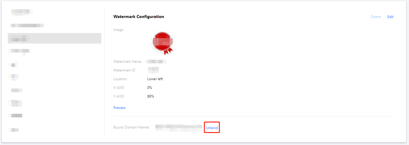 2. 연결되어 있는 도메인의 워터마크 템플릿을 선택하고 [바인딩 해제]를 클릭합니다.