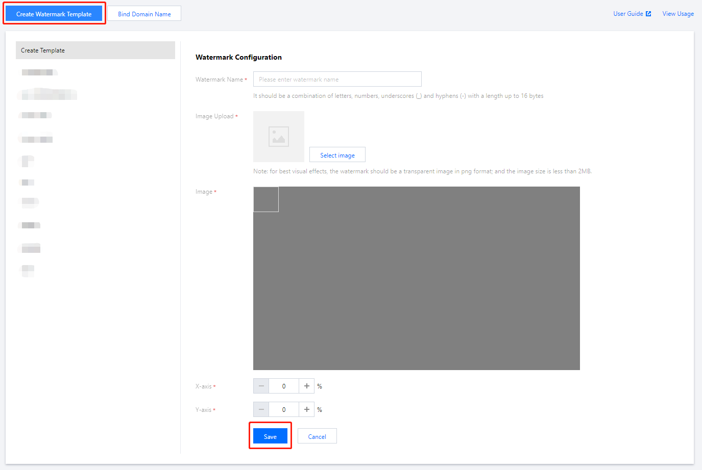 CSS 콘솔을 통한 워터마크 템플릿 생성에 대한 자세한 방법은 워터마크 템플릿 생성을 참조하십시오. API호출을 통해 워터마크를 생성하는 자세한 작업 방식은 워터마크 추가를 참조 바랍니다. 주의 사항