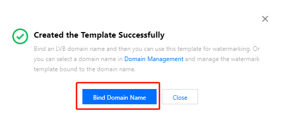 신규 워터마크 템플릿 생성 완료 후 도메인 연결: 워터마크 템플릿 생성 완료 후 안내창의 [도메인 바인딩]을 클릭합니다.