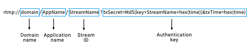 Tencent Cloud 표준에 부합하는 푸시 스트림 URL은 다음 네 부분으로 구성됩니다.