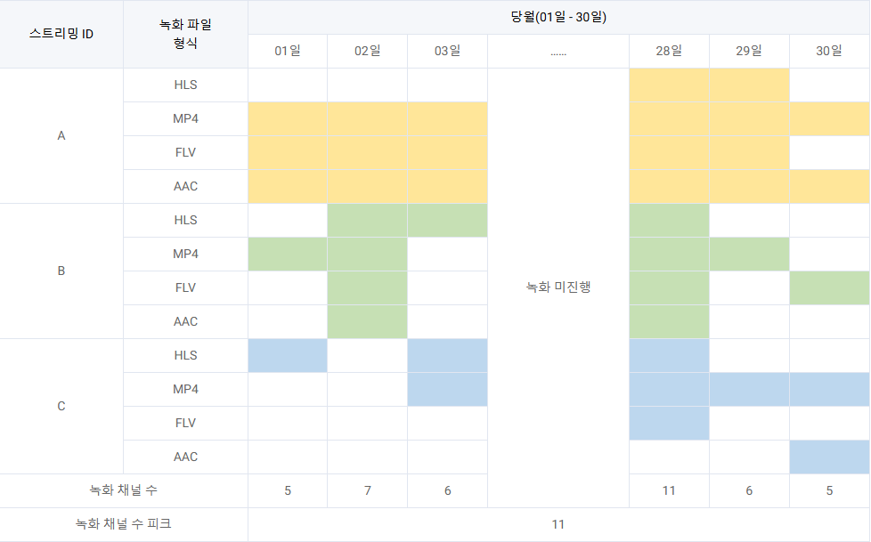 1개 채널 라이브 방송 스트리밍(스트리밍 ID 1개)을 1가지 파일 형식으로 녹화, 즉 1개 채널의 라이브 방송 녹화 작업을 한다면 5분 간격으로 현재 녹화 작업 수를 확인하고 당월 표본점의 최대치를 녹화 과금 기준인 월 피크 채널 수로 정합니다.