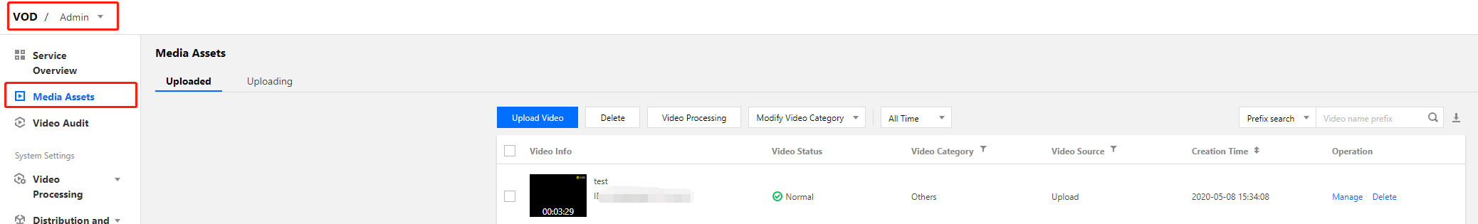 VOD 콘솔에 로그인하여 서브 애플리케이션을 선택해 이동한 후 왼쪽에 있는 미디어 자원 관리를 클릭하면 녹화된 모든 파일을 확인할 수 있습니다.