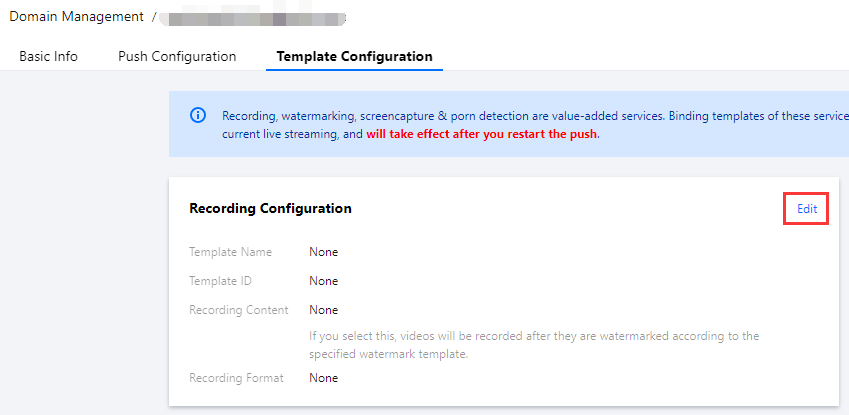 1. 도메인 관리로 이동하여 대상 푸시 도메인을 클릭하거나 관리를 클릭하여 도메인 이름 세부 정보 페이지로 이동합니다. 2. 템플릿 구성 탭을 선택하고, 녹화 구성 섹션의 오른쪽 상단 모서리에 있는 편집을 클릭합니다.