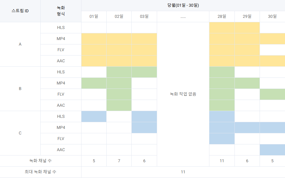 하나의 형식으로 녹음된 하나의 스트림(스트림 ID)은 하나의 녹음 채널로 계산됩니다. 동시 녹화 채널 수는 5분 간격으로 수집되며, 매월 최대 개수가 과금에 사용됩니다.