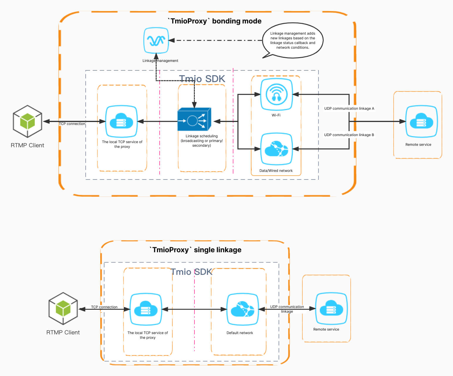 tmio::TmioFeatureConfig option;option_.protocol = tmio::Protocol::SRT;option_.trans_mode = static_cast<int>(tmio::SrtTransMode::SRT_TRANS_BACKUP);/*-----------------------------------------------------------*/{//필요에 따라 여러 연결을 추가할 수 있습니다option_.addAvailableNet(net_name, local_addr, remote_url, 0, weight, -1);}/*-----------------------------------------------------------*/proxy_->start(local_url, remote_url, &option_);