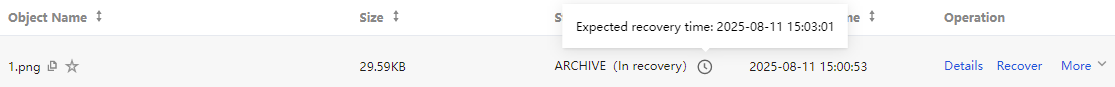 다양한 모드에 따라 데이터 검색 비용이 다릅니다. 자세한 내용은 데이터 검색 비용을 참조하십시오. 복사본 유효 기간: 복사본이 자동으로 만료되고 삭제되는 일 수입니다. 값 범위는 1일-365일입니다. 객체가 성공적으로 복구된 후 복구를 다시 클릭하여 팝업 창에서 복사본의 유효 기간을 변경할 수 있습니다.