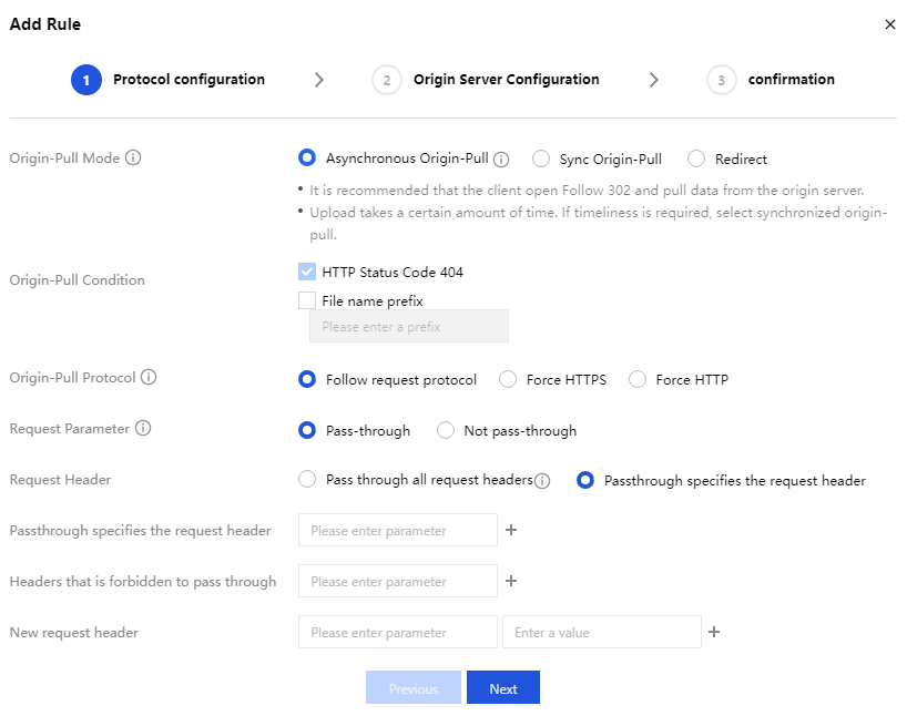 6. 선택한 Origin-pull 모드에 따라 다음 정보를 구성하도록 선택하고 다음 단계를 클릭합니다.