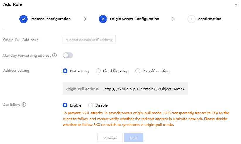 3XX 종속 정책: 이 정책이 활성화된 경우 원본이 3xx 리디렉션을 반환하면 COS가 이를 따라 다른 원본에서 데이터를 가져옵니다. 비활성화를 선택하면 리소스를 풀링하지 않습니다.