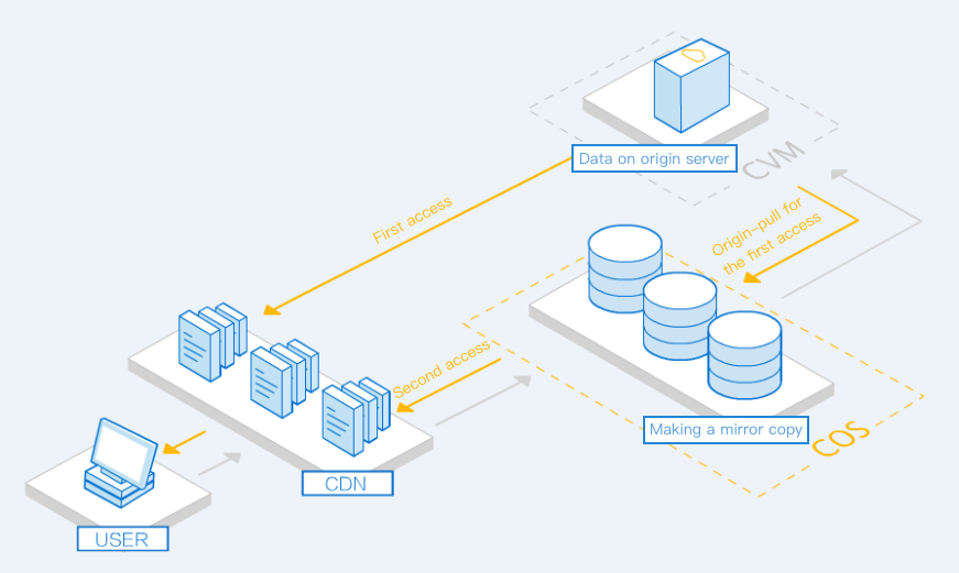 Origin-pull 동기화: 요청한 파일이 COS에 없는 경우, COS는 지정된 원본에서 파일을 검색하여 클라이언트에 반환하고 버킷에 업로드합니다.