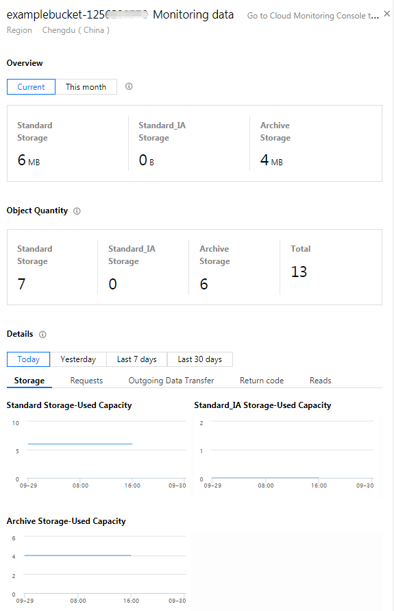 스토리지 용량 및 객체 수량은 2020년 3월 1일 이후 데이터만 조회할 수 있으며, 더 많은 상세 데이터를 조회해야 하는 경우 과금 센터에서 해당 시간대를 선택하고 데이터를 내보내 조회할 수 있습니다. 서브 계정에서의 조회 방법