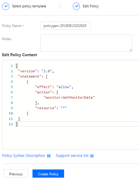 정책 템플릿은 클라우드 모니터링에 액세스할 수 있는 모든 권한을 부여합니다. 계정 보안이 필요한 경우 서브 계정의 읽기 권한에 대한 액세스 정책을 사용자 정의 설정하십시오.