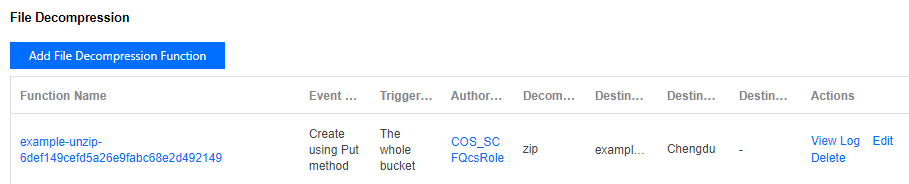 이전에 COS 콘솔에서 버킷에 파일 압축 해제 규칙을 추가한 경우, SCF 콘솔에서 생성한 파일 압축 해제 함수를 확인할 수 있습니다. 해당 파일 압축 해제 함수는 삭제하지 마십시오. 삭제할 경우 규칙이 적용되지 않습니다. 이미 런칭된 SCF의 리전에서는 ZIP 패키지 압축 해제를 지원합니다. 이에는 광저우, 상하이, 베이징, 청두, 중국홍콩, 싱가포르, 실리콘밸리 등이 포함되어 있으며, 지원하는 리전에 대한 자세한 내용은 SCF 제품 문서를 참고하십시오. 압축 파일의 디렉터리 또는 파일 이름은 반드시 UTF-8 또는 GB 2312 인코딩을 사용하십시오. 그렇지 않을 경우 압축 해제 후 파일 이름 또는 디렉터리 이름이 깨지거나 압축 해제 프로세스가 중단되는 등의 상황이 발생할 수 있습니다. 오류가 발생하는 경우 생성한 함수 오른쪽에 있는 로그 조회를 클릭하여 SCF 콘솔로 이동해 로그의 오류 상세 정보를 확인할 수 있습니다.
