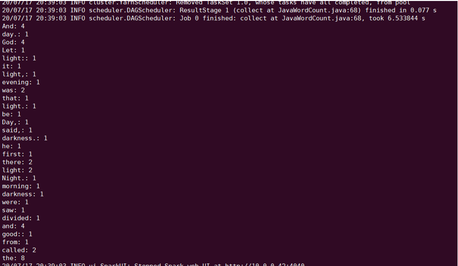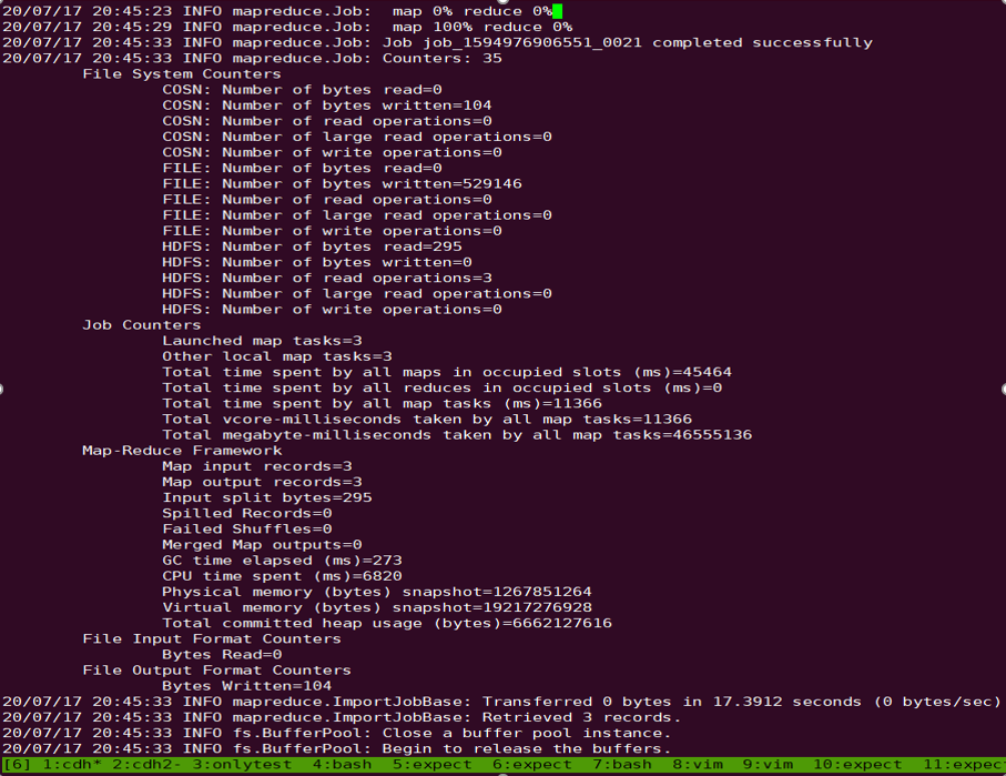 spark-submit --class org.apache.spark.examples.JavaWordCount --executor-memory 4g --executor-cores 4 ./spark-examples-1.6.0-cdh5.16.1-hadoop2.6.0-cdh5.16.1.jar cosn://examplebucket-1250000000/wordcount