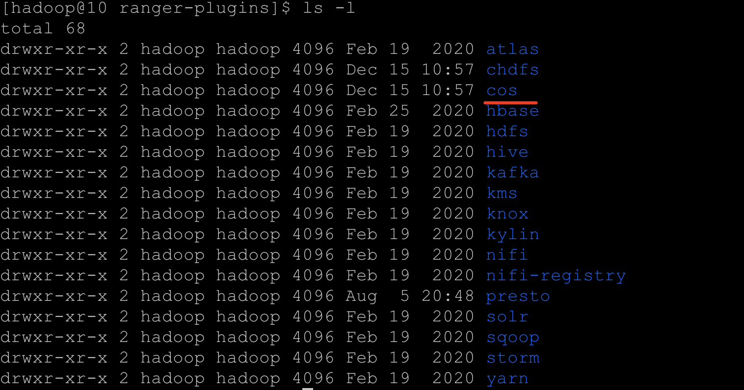 2. cos-chdfs-ranger-plugin-xxx.jar를 COS 디렉터리에 저장합니다. 최소한 jar 패키지에 대한 r 권한이 있어야 합니다. 동시에 cos-ranger.json 파일을 넣어주어야 하며, Github에서 얻을 수 있습니다. 3. Ranger 서비스를 재시작합니다.