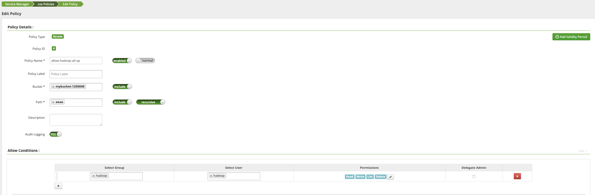 ranger-cos-security.xml 파일에서 ranger.plugin.cos.policy.pollIntervalMs 값(밀리초)을 줄이고 COS Ranger Service를 다시 시작합니다. Policy 관련 테스트가 끝난 후에는 다시 원래 값으로 변경하는 것이 좋습니다(시간 간격이 너무 짧으면 라운드 로빈 빈도가 높아 CPU 사용률이 높아짐).