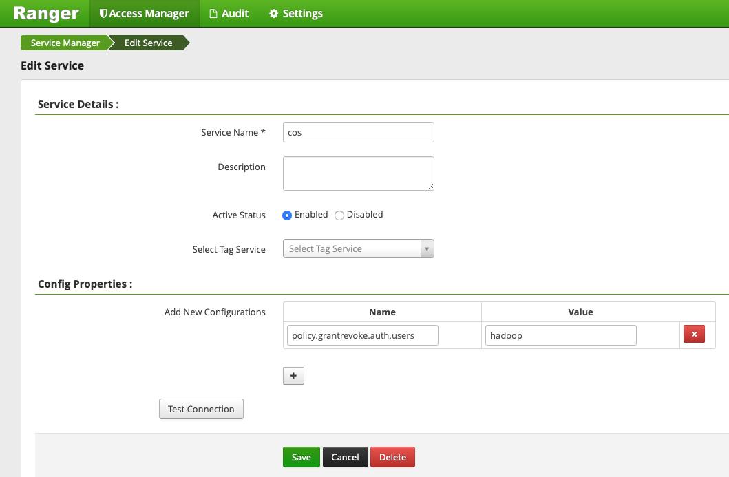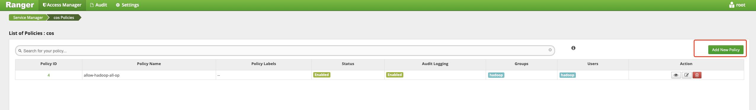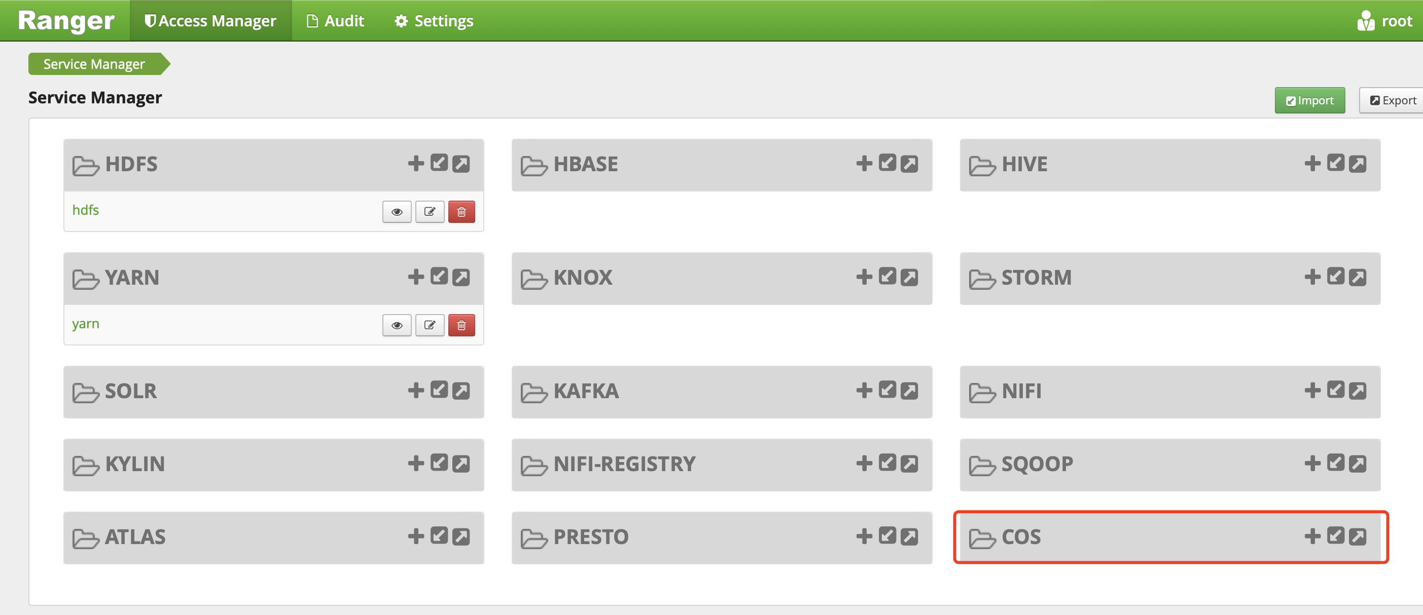 5. 서비스가 생성되면 Ranger 콘솔에서 COS 서비스를 다음과 같이 볼 수 있습니다.