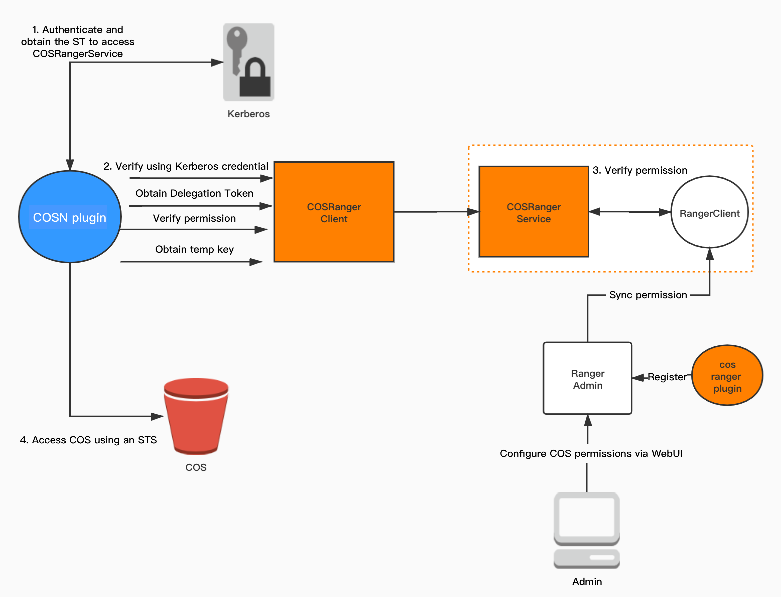 3. COS Ranger Client: COSN 플러그 인을 동적으로 로딩하여 권한 인증 요청을 COS Ranger Service에 전달합니다.